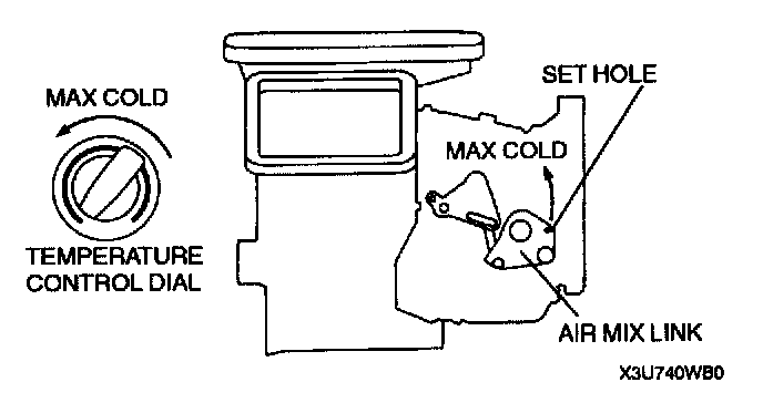 2. Set the air mix link to max cold in the direction shown by the arrow and insert a screwdriver at the set hole.
