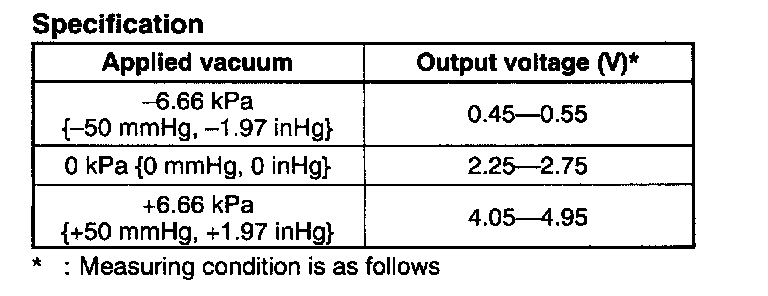 6. Decrease the applied pressure from +.66 kPa {+50 mmHg, +1.97 inHg} to -6.66 kPa {-50 mmHg, -1.97 inHg} and verify that the PCM terminal 62 voltage decreases accordingly as specified.