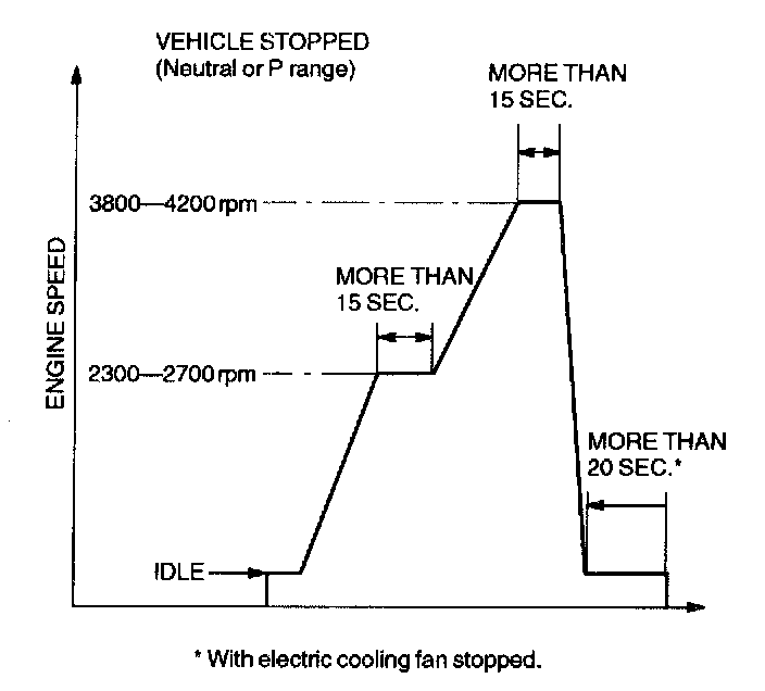 3. Perform no load racing at the engine speed shown in the graph, then idle the engine for more than 20 seconds after the cooling fan stopped. If possible, monitor RPM PID for engine speed and FAN3 PID for cooling fan status during this procedure.
