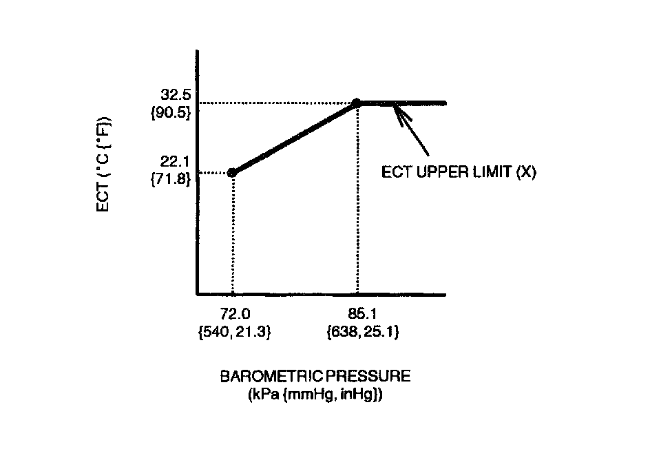 - ECT is -10 °C - X °C {14 °F - X °F} (X, the ECT upper limit, is determined according to the barometric pressure as shown in the graph.)
