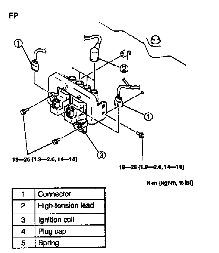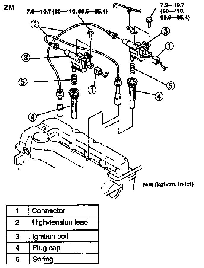 CAUTION: Disconnecting the ignition coil and plug cap can tear the plug cap off and cause damage to the connecting part. Disconnect the ignition coil and plug cap only when each component needs to be replaced, and be careful not to tear and damage them.1. Disconnect the negative battery cable.