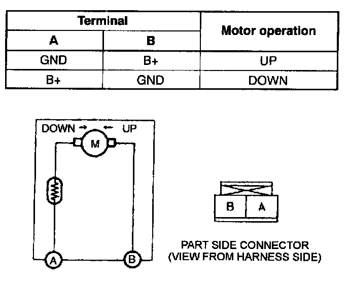 2. Apply battery positive voltage to the power window motor terminals and inspect the operation of the power window motor.