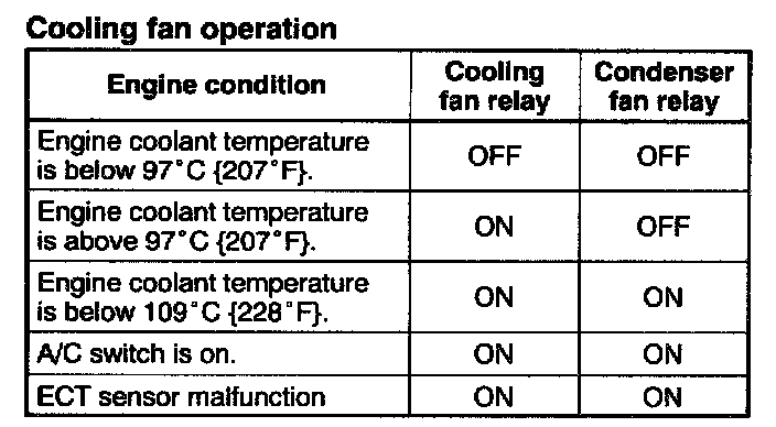 - If the operation sound is not heard, inspect cooling fan relay and open circuit in wiring harness and connectors.