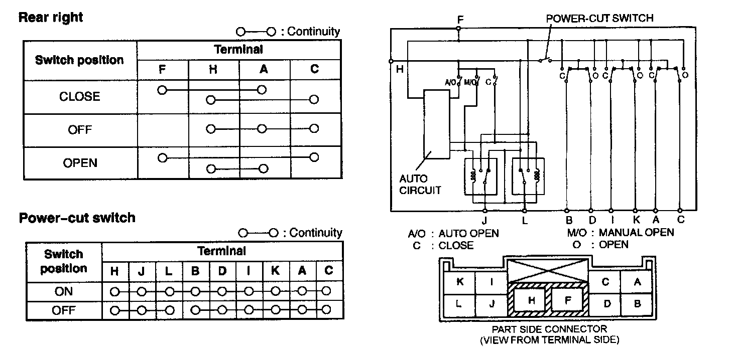 1. Remove the power window main switch.2. When inspecting the passenger's side and the rear, turn the power-cut switch to ON.