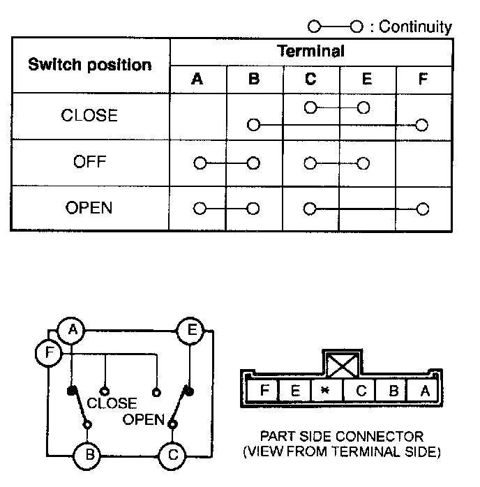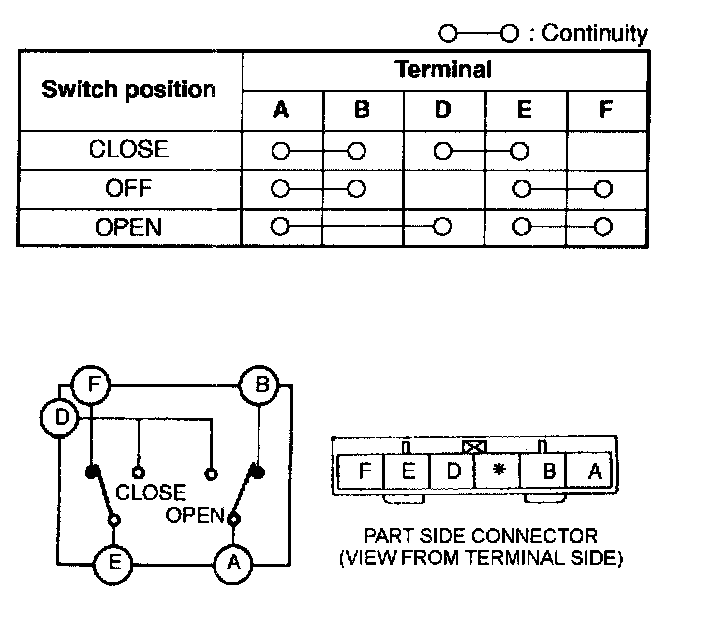 3. Inspect for continuity between the power window subswitch terminals using an ohmmeter.