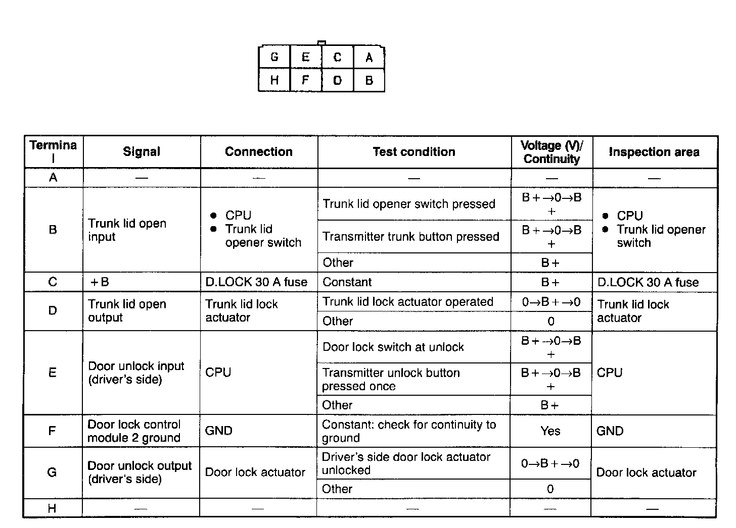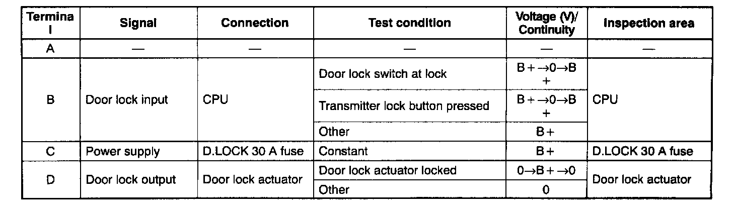 1. Measure the voltage at the door lock control module 2 terminals as indicated below.