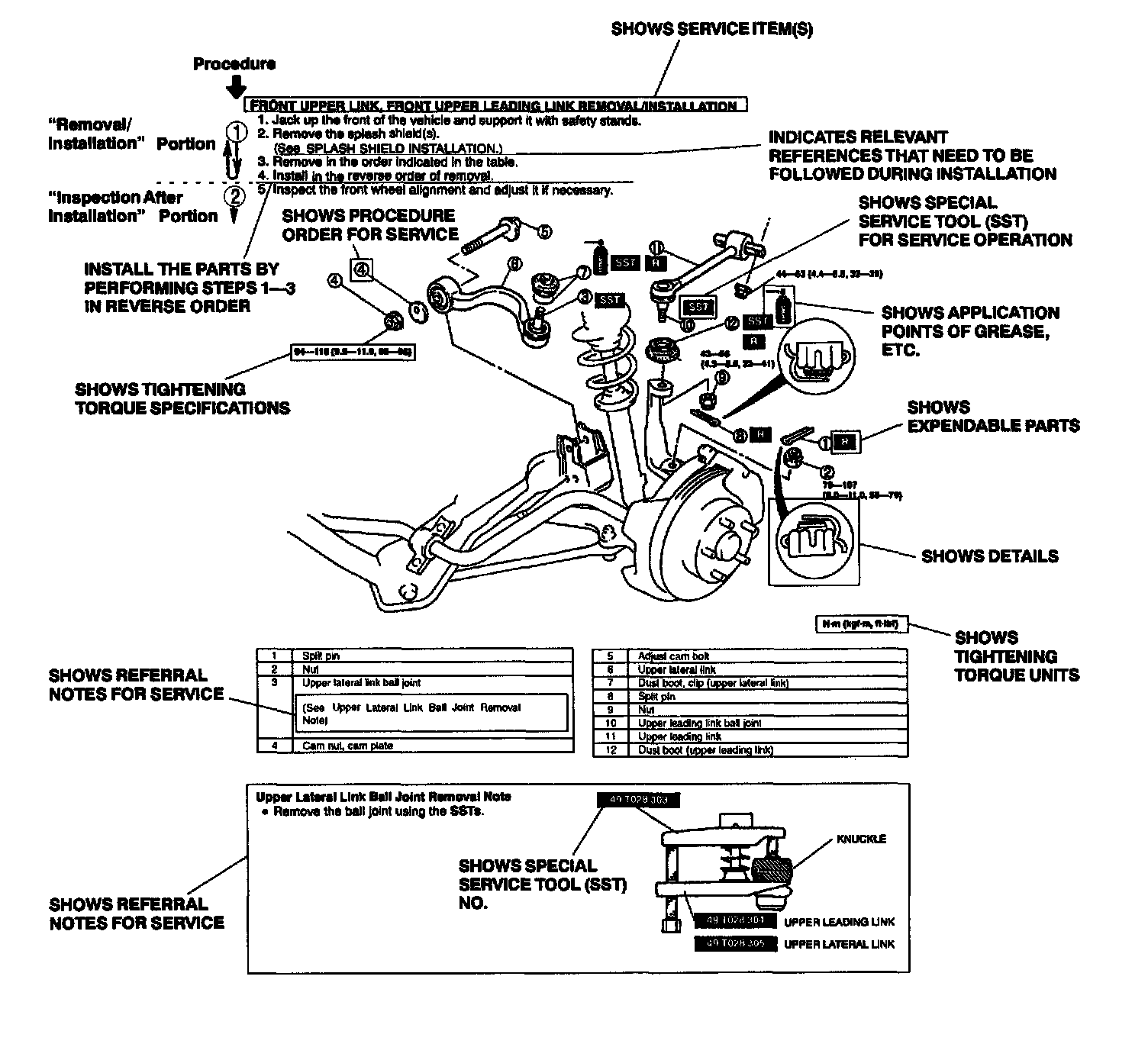 2. Expendable parts, tightening torques, and symbols for oil, grease, and sealant are shown in the overview illustration. In addition, symbols indicating parts requiring the use of special service tools or equivalent are also shown.