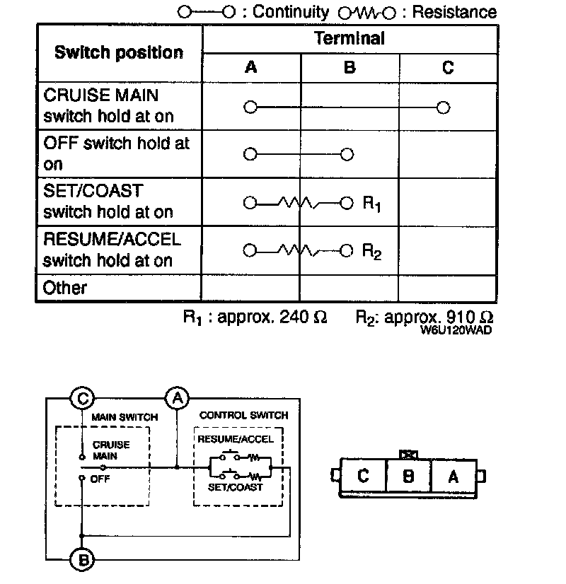 4. Measure the resistance and check for continuity between the cruise control switch terminals by using an ohmmeter.