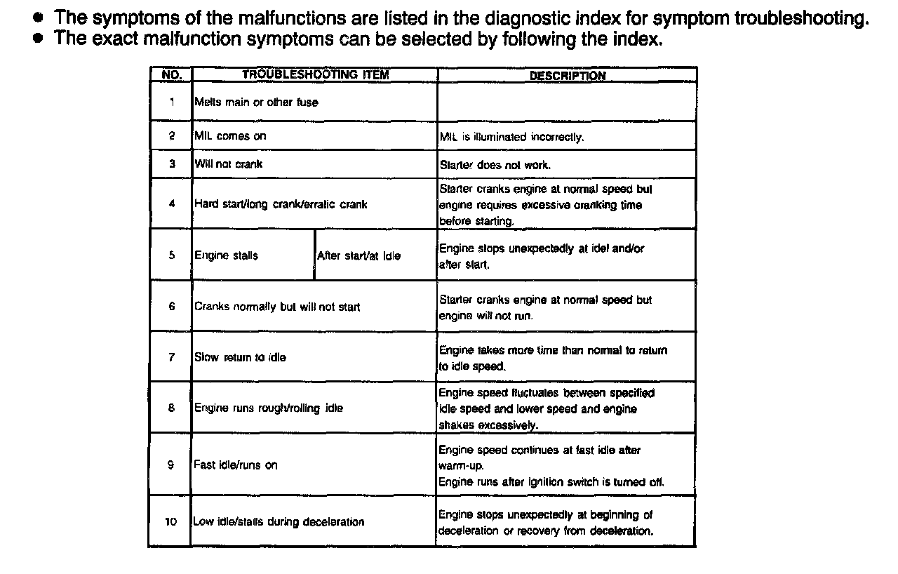 - The diagnostic index lists the symptoms of specific malfunctions. Select the symptoms related or most closely relating to the malfunction.