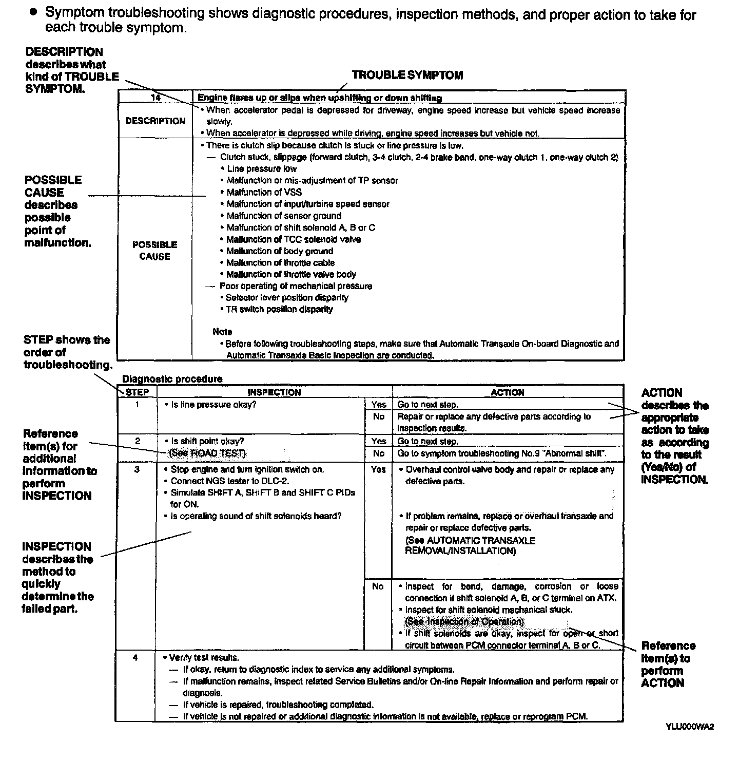 - The quick diagnosis chart lists diagnosis and inspection procedures to be performed specifically relating to the cause of the malfunction.
