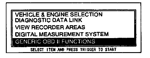 1. Perform the NGS tester hook-up procedure.2. Move the cursor to GENERIC OBD II FUNCTIONS.
