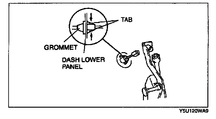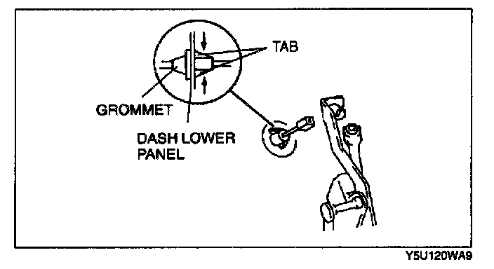 3. Press the tabs of the grommet, and remove it from the dash lower panel.
