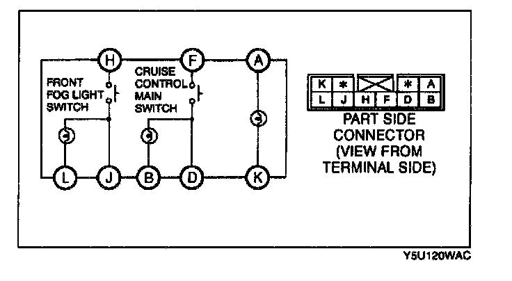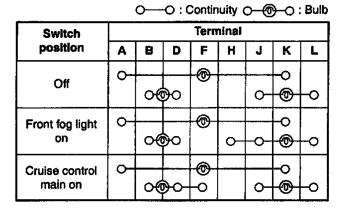 Inspect for continuity between the cruise control main switch terminals using an ohmmeter.