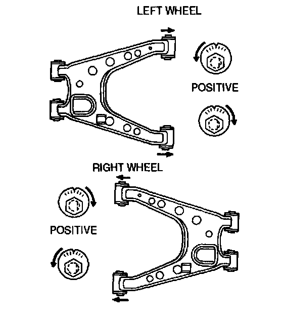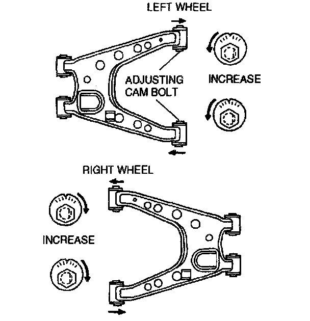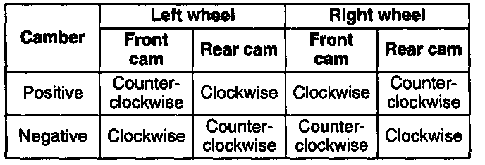 2. Turn the front and rear adjusting cam bolts the same amount in the opposite direction equally to provide the correct camber angle.