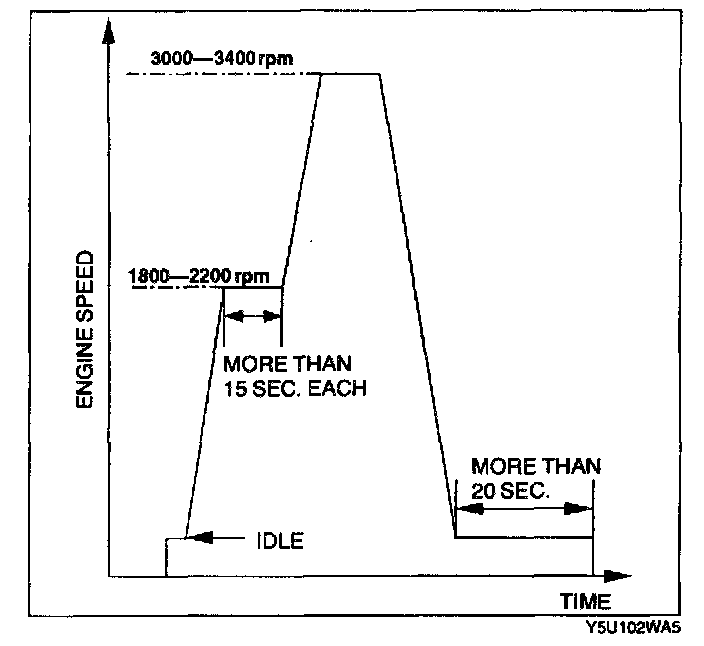 3. Perform no load racing at the engine speed shown in the graph, then idle the engine for more than 20 seconds after the cooling fan stopped. If possible, monitor RPM PID for engine speed and FAN2 PID (with A/C), FAN1 PID (without A/C) for cooling fan status during this procedure.