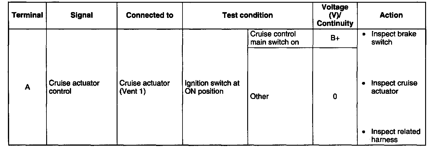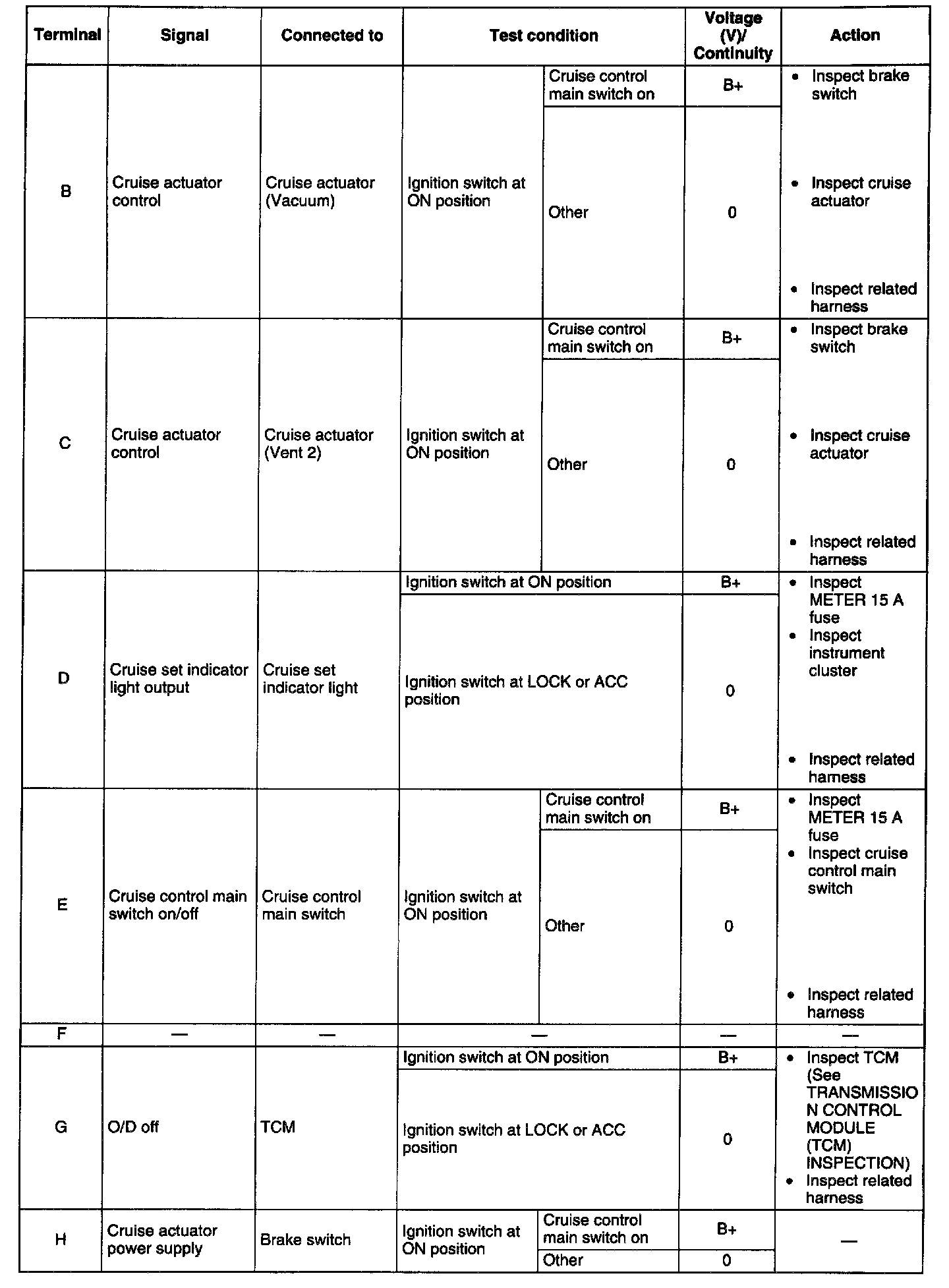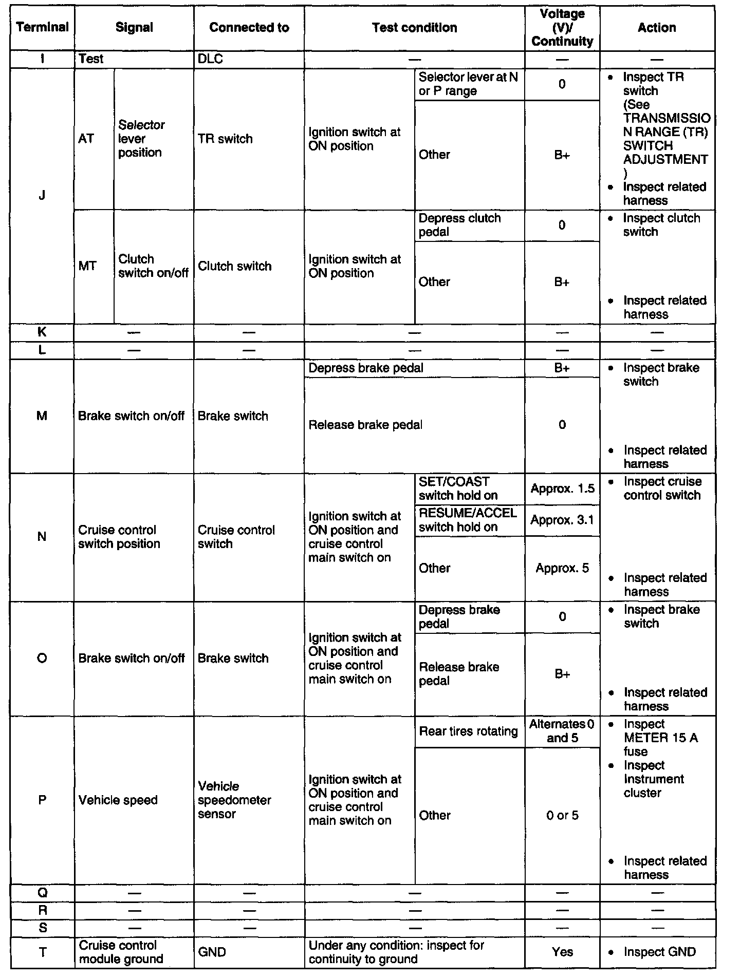 4. Measure the voltage at the cruise control module terminals as indicated.