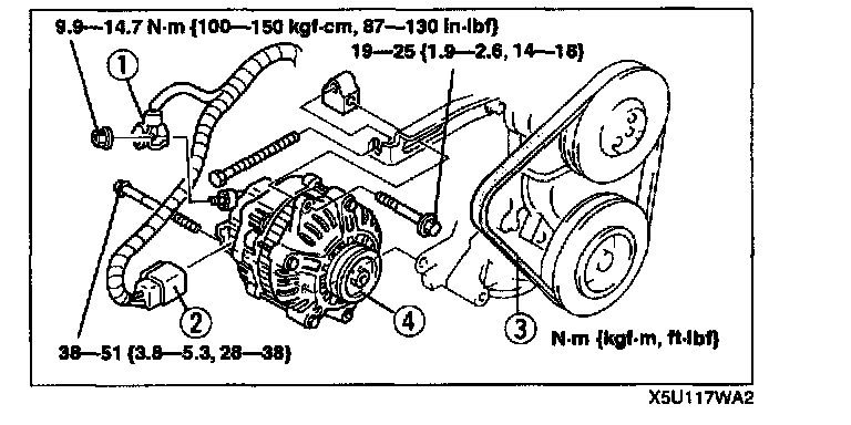 GENERATOR REMOVAL/INSTALLATIONWARNING: When the battery cables are connected, touching the vehicle body with generator terminal B will generate sparks. This can cause personal injury, fire, and damage to the electrical components. Always disconnect the battery before performing the following operation.