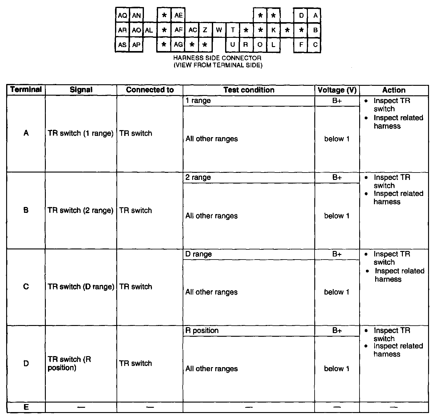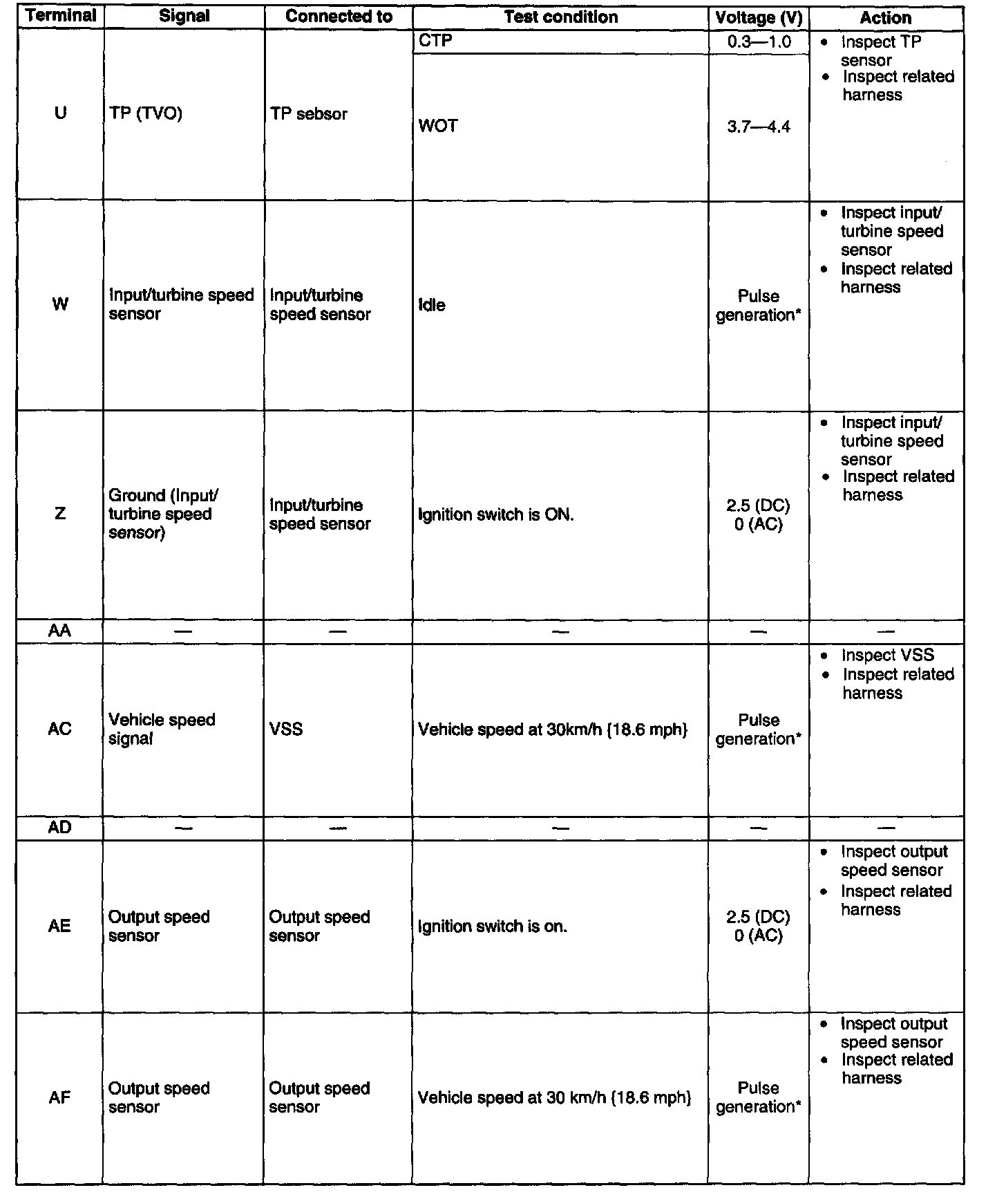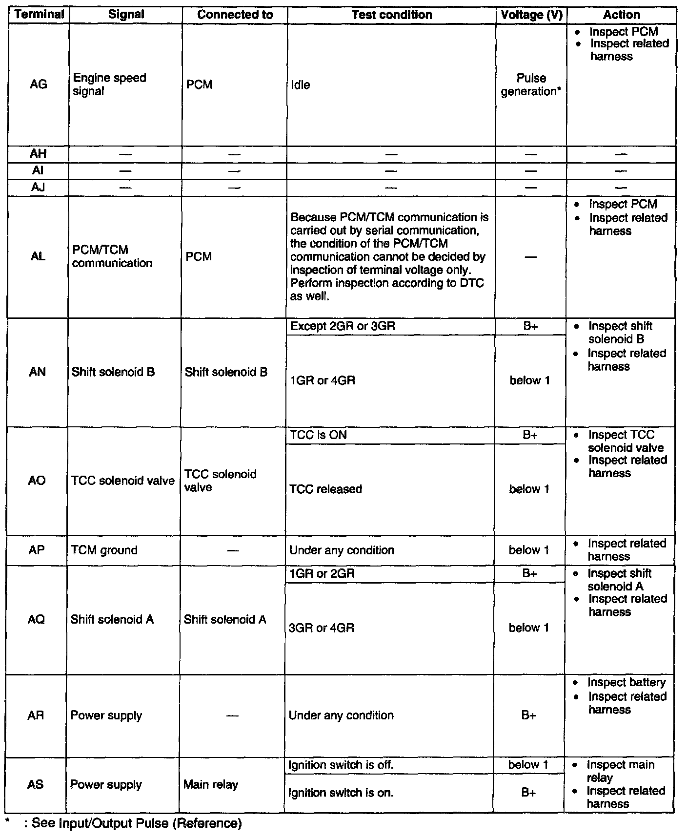 ^ Use the ground of terminal AP of the TCM when measuring terminal voltage as an error may occur when the negative (-) lead of the circuit tester is connected to ground.