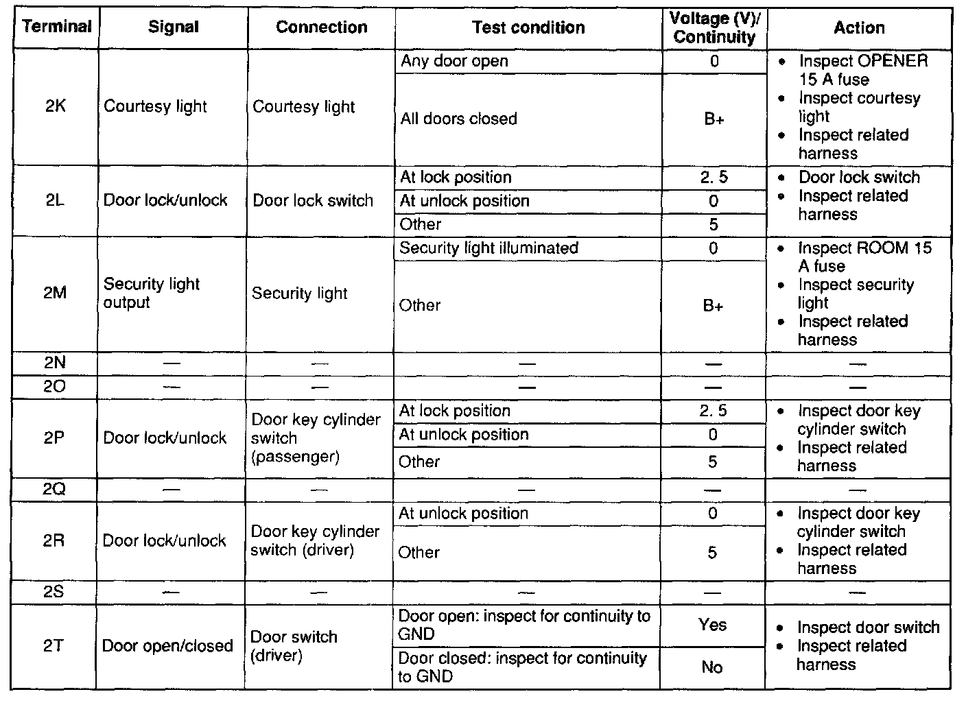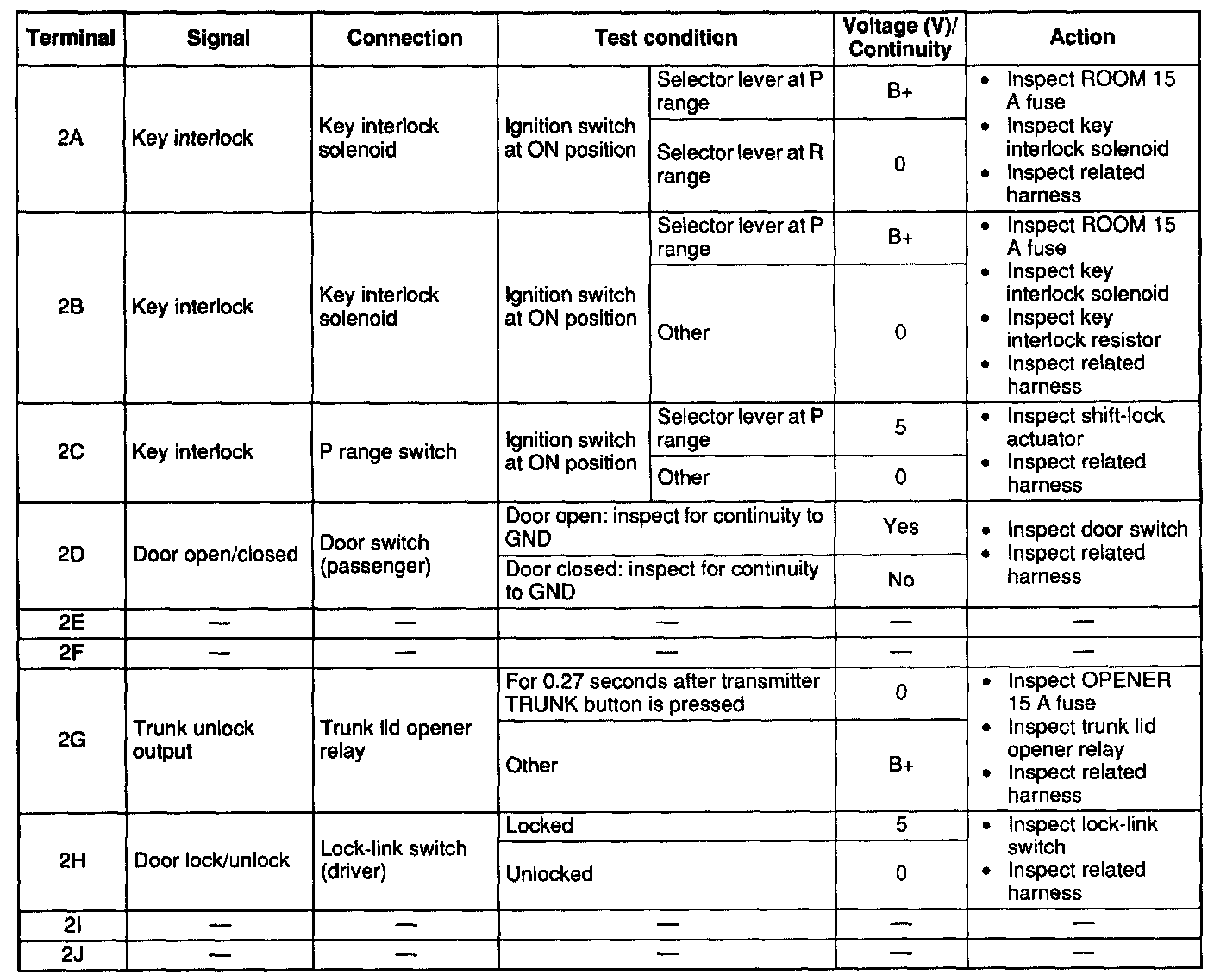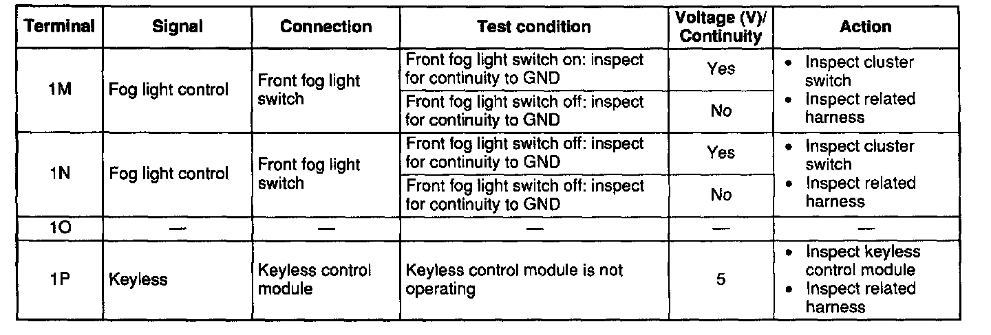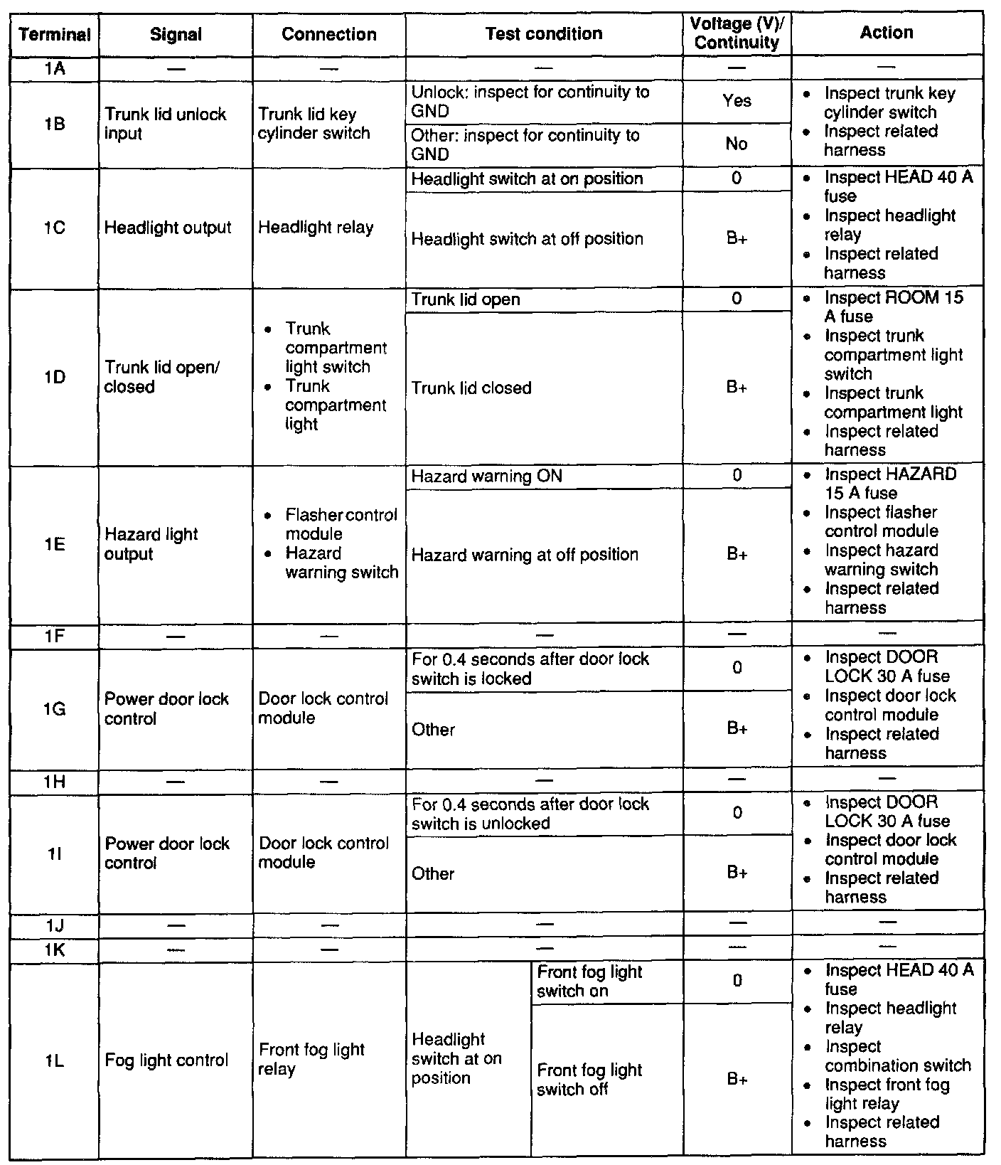 - If not as specified, inspect the parts listed under "Inspection area" and the related wiring harnesses.