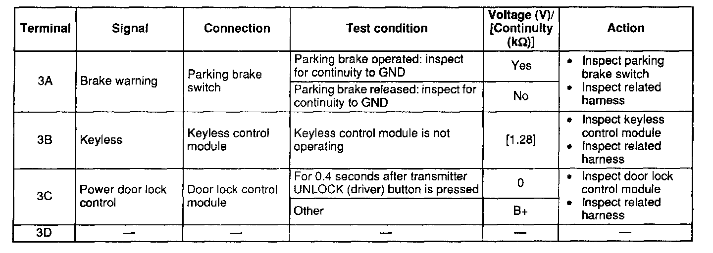 - When measuring the voltage at terminal 3B of connector D, use a voltmeter with sufficiently high input impedance (1 MOhms or more).