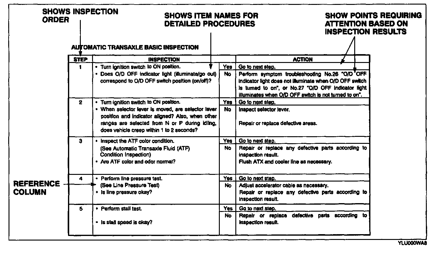 - Although inspections and adjustments are performed according to the reference column procedures if the cause of the malfunction is discovered during basic inspection, continue the procedures as indicated In the remarks column.