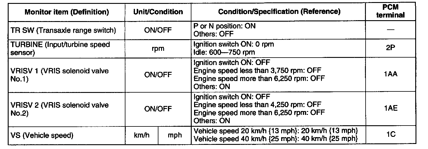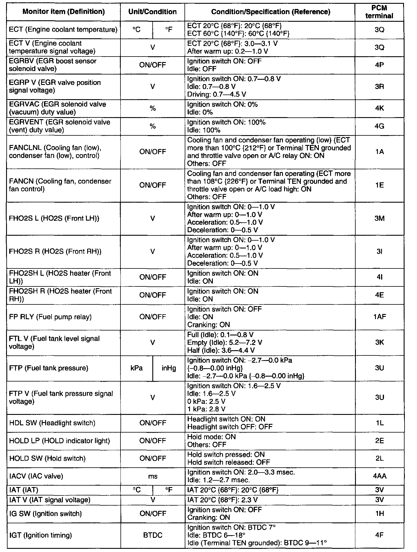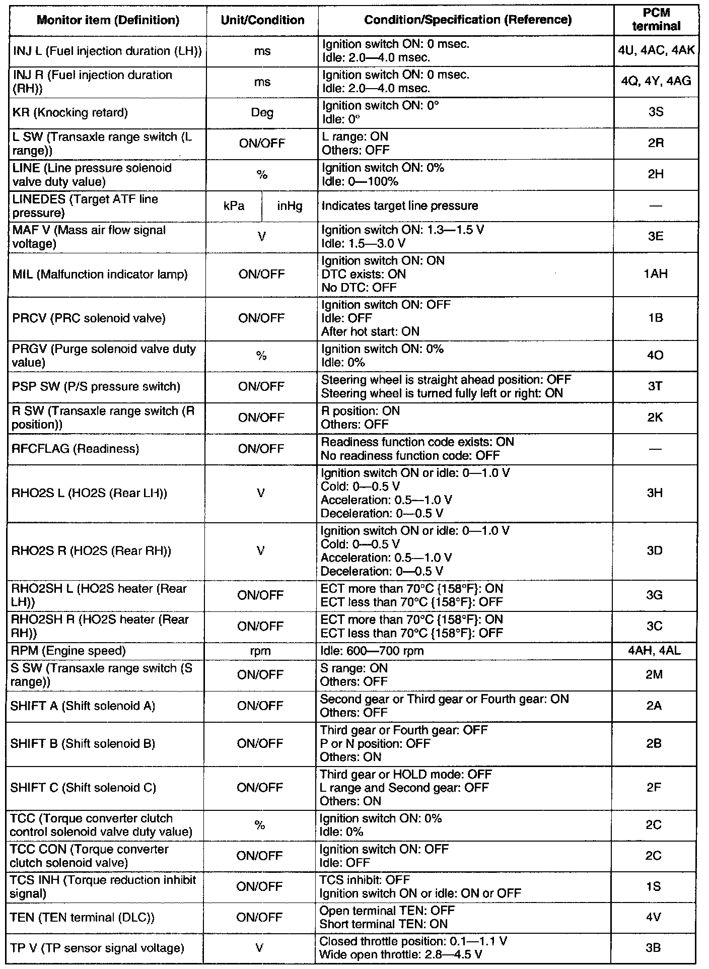 NOTE: The "PID/DATA MONITOR AND RECORD" function is to monitor the calculation value of input/output signals in the PCM. Deviation in the value does not always indicate malfunction in the related input/output devices (sensors and solenoids).