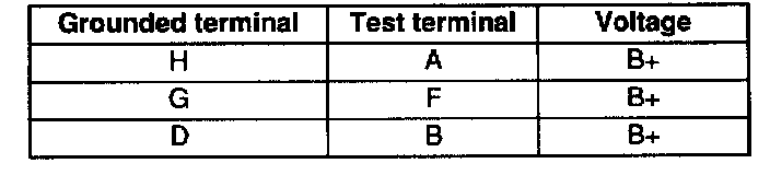 4. Measure the voltage at the terminals of the door lock control module connector with the following terminals connected to GND.