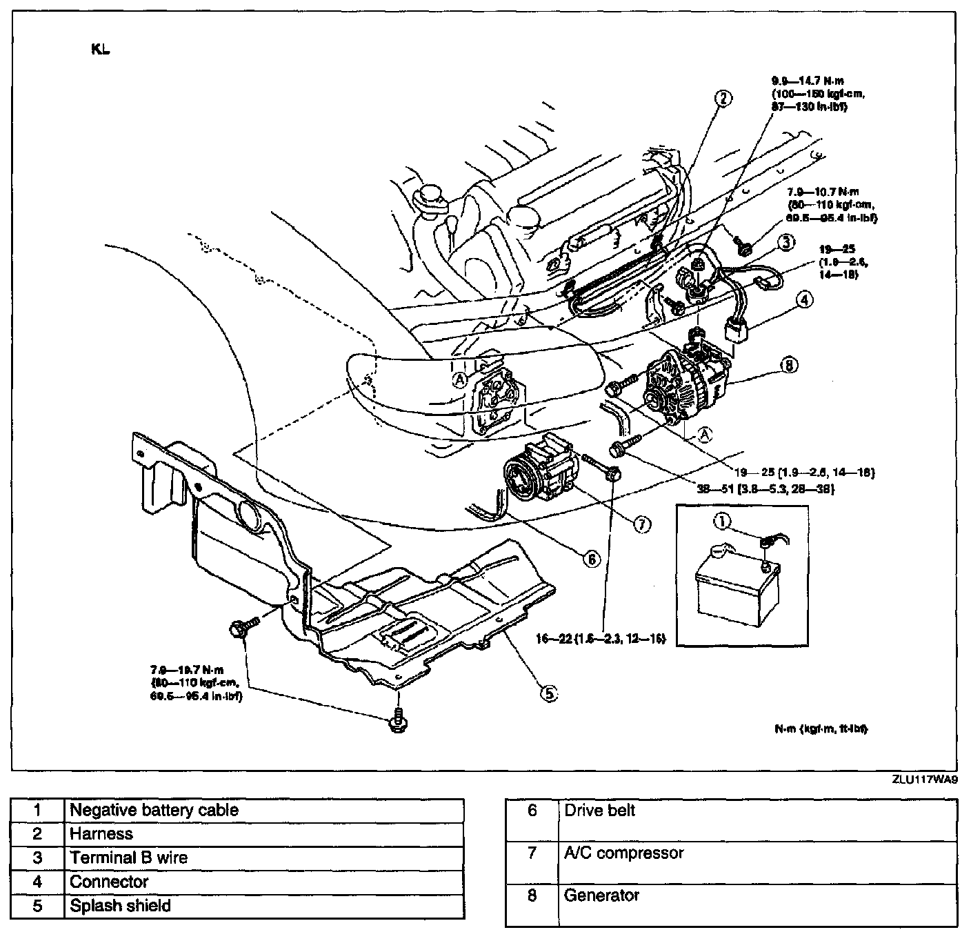 - Disconnecting generator terminal B before disconnecting the negative battery cable can damage the generator harness and connector.