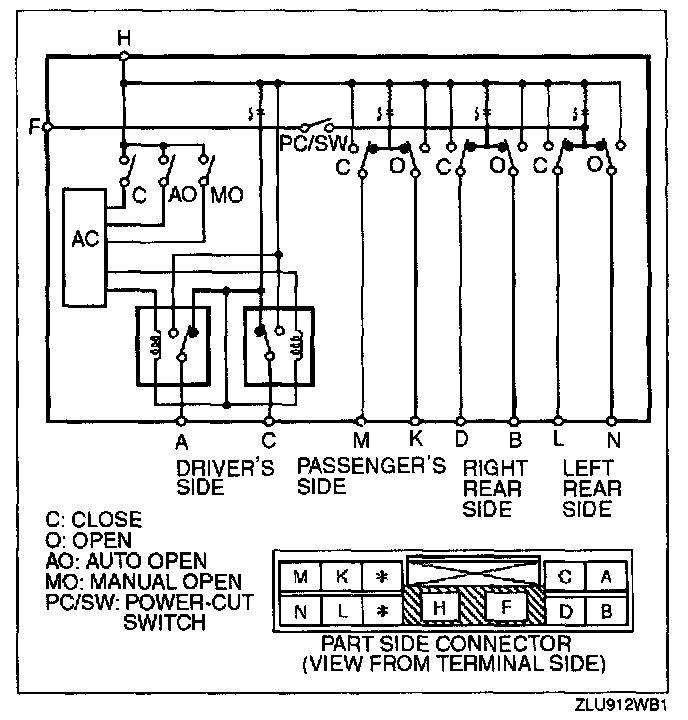 1. Inspect for continuity between the terminals of the power window main switch connector with the main switch in the following positions.2. When inspecting the driver's side, connect the B+ to terminal H and connect the GND to the terminal F.