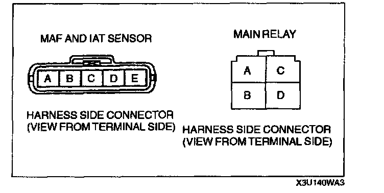 - Power circuit (MAF sensor connector terminal A and main relay terminal D through common connector)