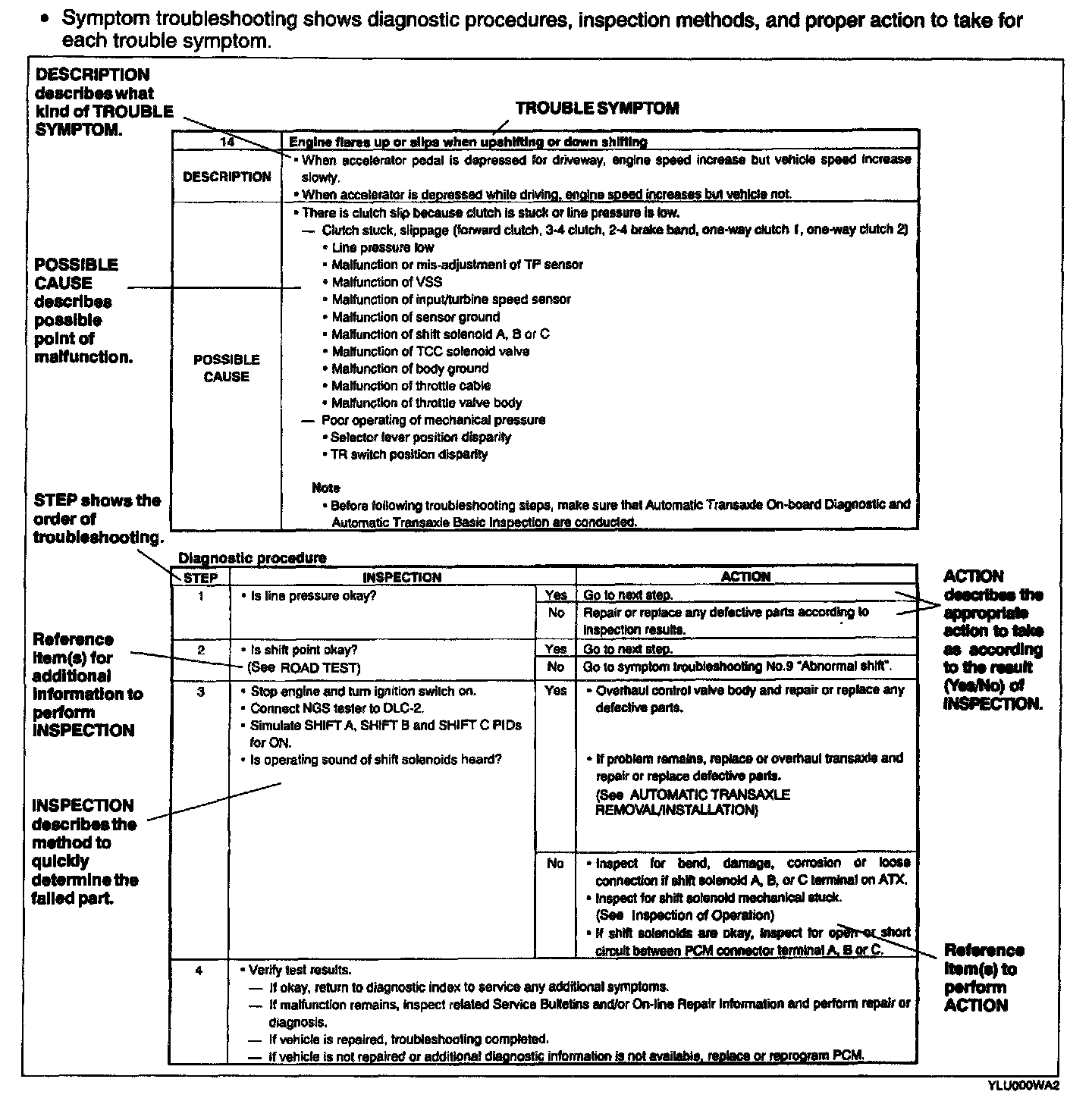 - The quick diagnosis chart lists diagnosis and inspection procedures to be performed specifically relating to the cause of the malfunction.
