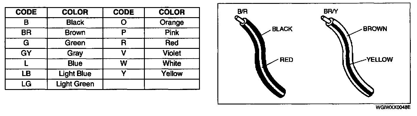 - Two-color wires are indicated by a two-color code symbol
