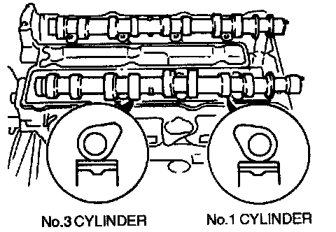 1. Assemble camshaft onto the cylinder head, facing the cam noses at No.1 and No.3 cylinders as shown.