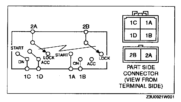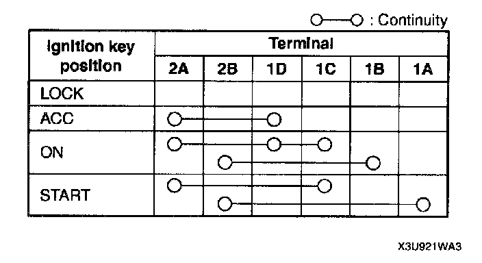 4. Inspect for continuity between the ignition switch terminals using an ohmmeter.
