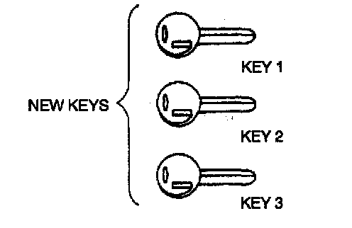 1. Turn ignition switch to ON while the security light is off and count three illumination cycles. As the light goes out after the third illumination, turn key to LOCK.