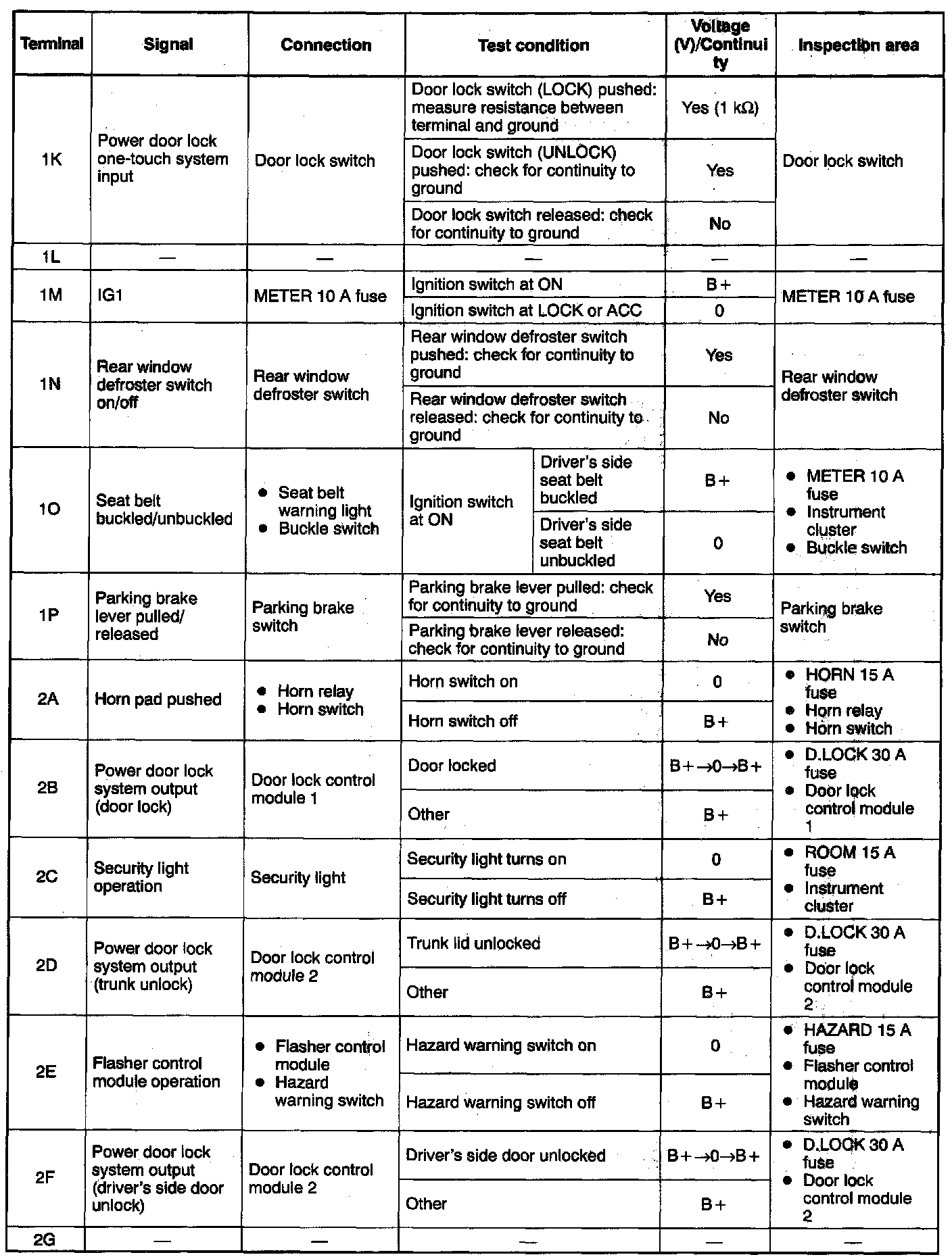 Terminal Voltage List (Reference) / Terminals (1K - 2G):