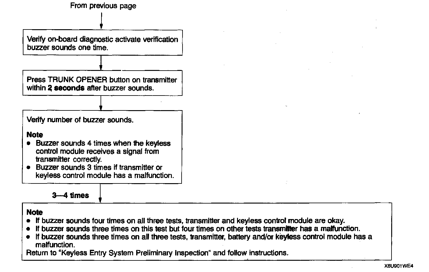 KEYLESS ENTRY SYSTEM ON-BOARD DIAGNOSTICThere are two functions for the keyless entry system on-board diagnostic (OBD). OBD function 1 tells the keyless control module and CPU to activate the power door lock and trunk lid opener systems without the transmitter. OBD function 2 monitors a keyless entry demand signal sent from the transmitter and used inside the keyless control module. OBD function 2 diagnoses the transmitter, integrated antenna and the keyless control module.