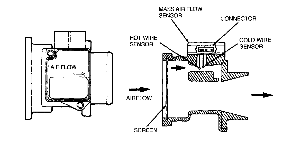 - The mass air flow (MAF) sensor uses a hot wire to measure the amount of mass air intake flow.