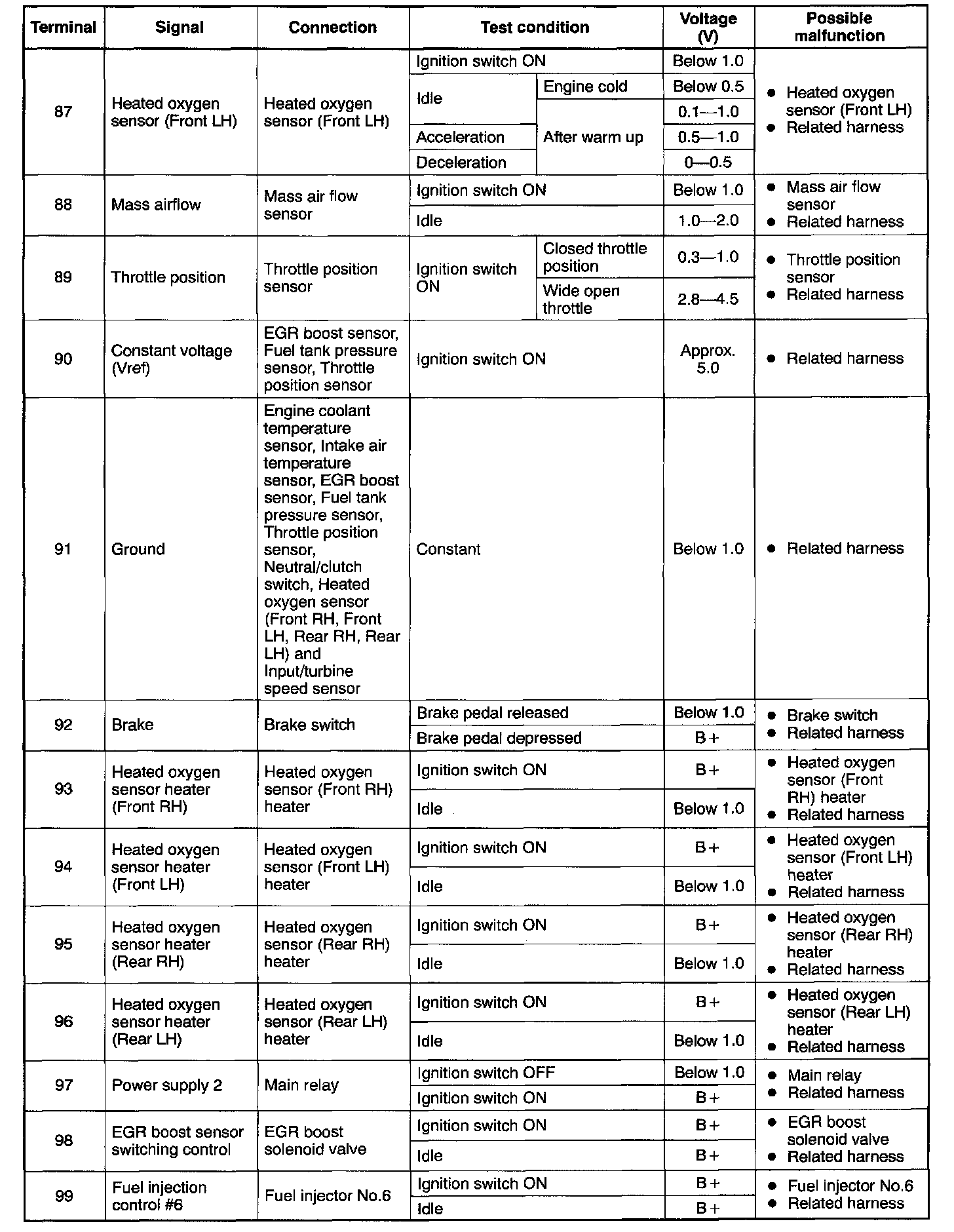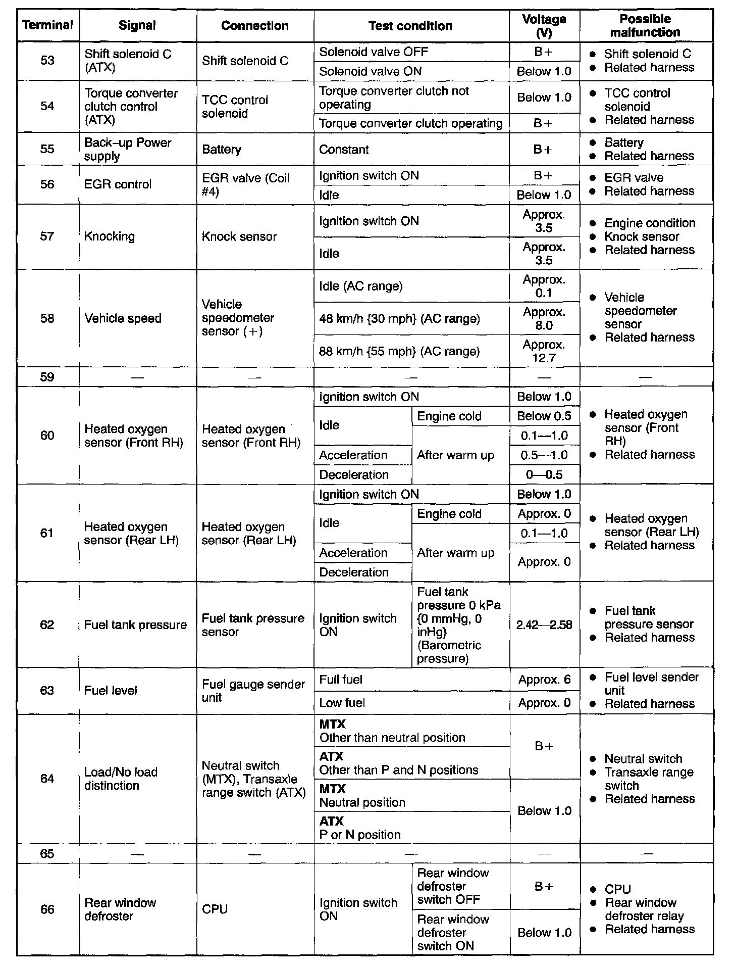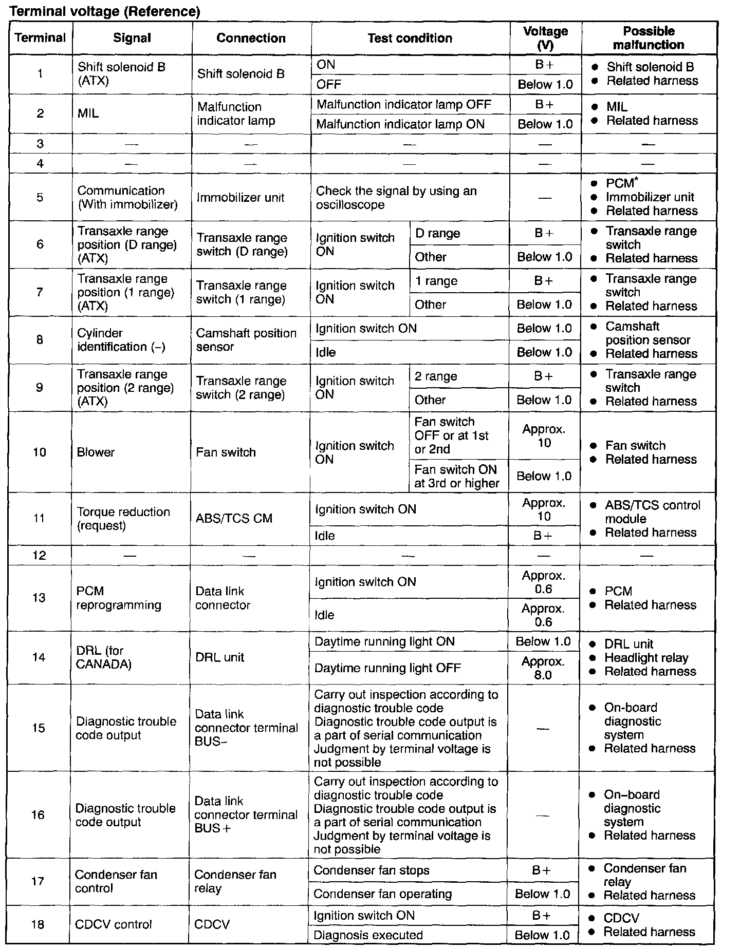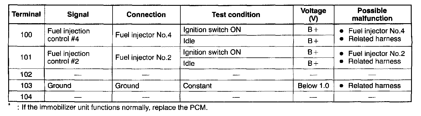 CAUTION: The PCM terminal voltages vary with change in measuring conditions and vehicle conditions. Always carry out a total inspection of the input systems, output systems, and PCM to determine the cause of trouble. Otherwise, diagnosis will be incorrect.