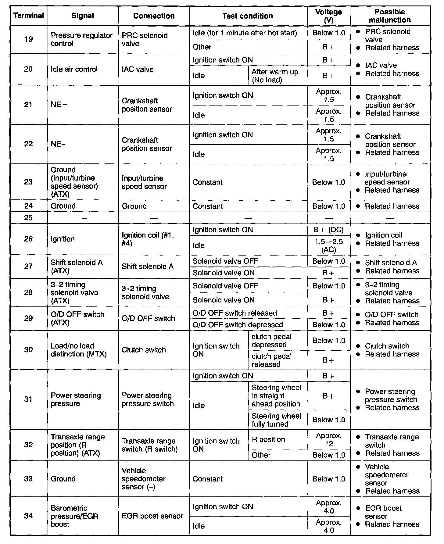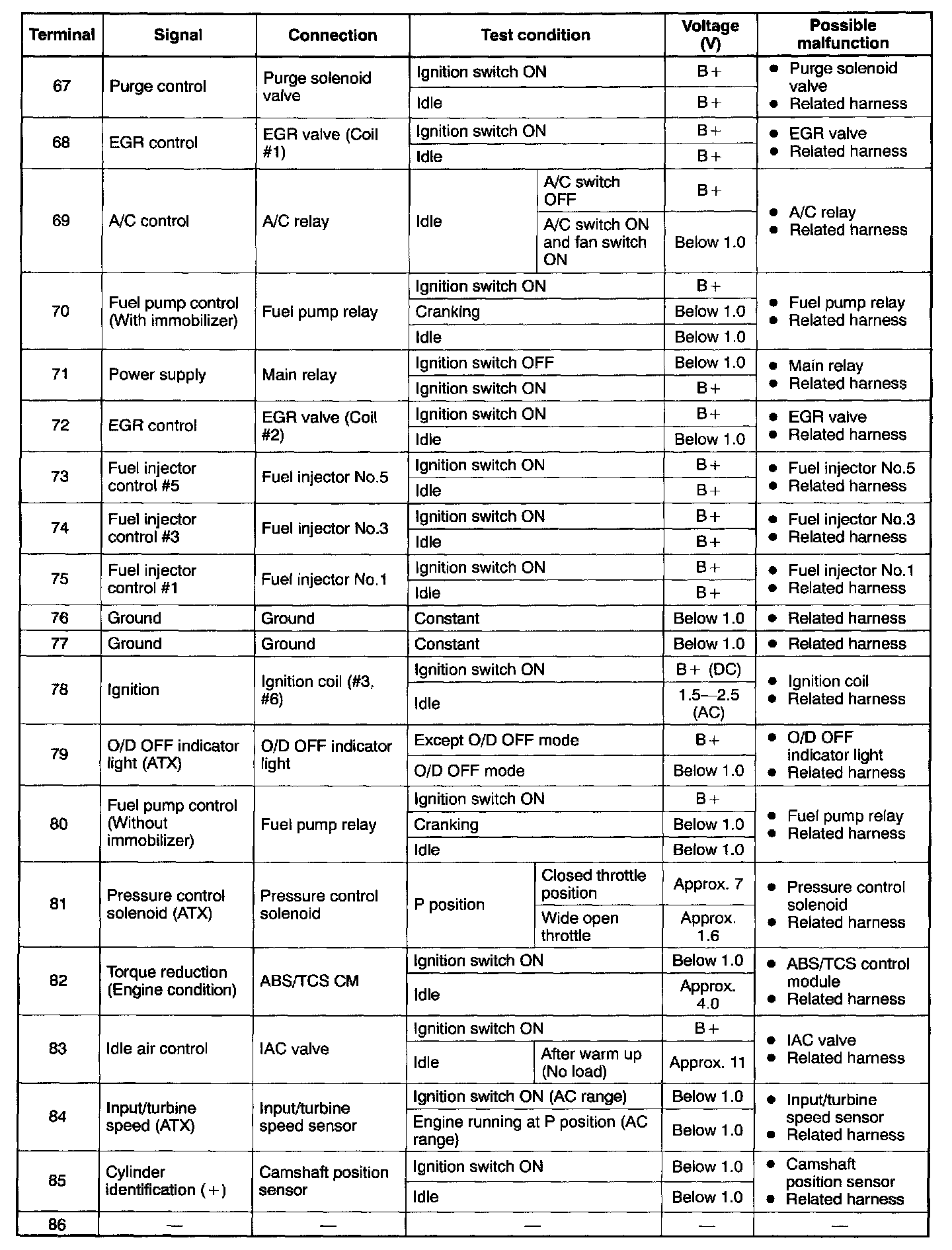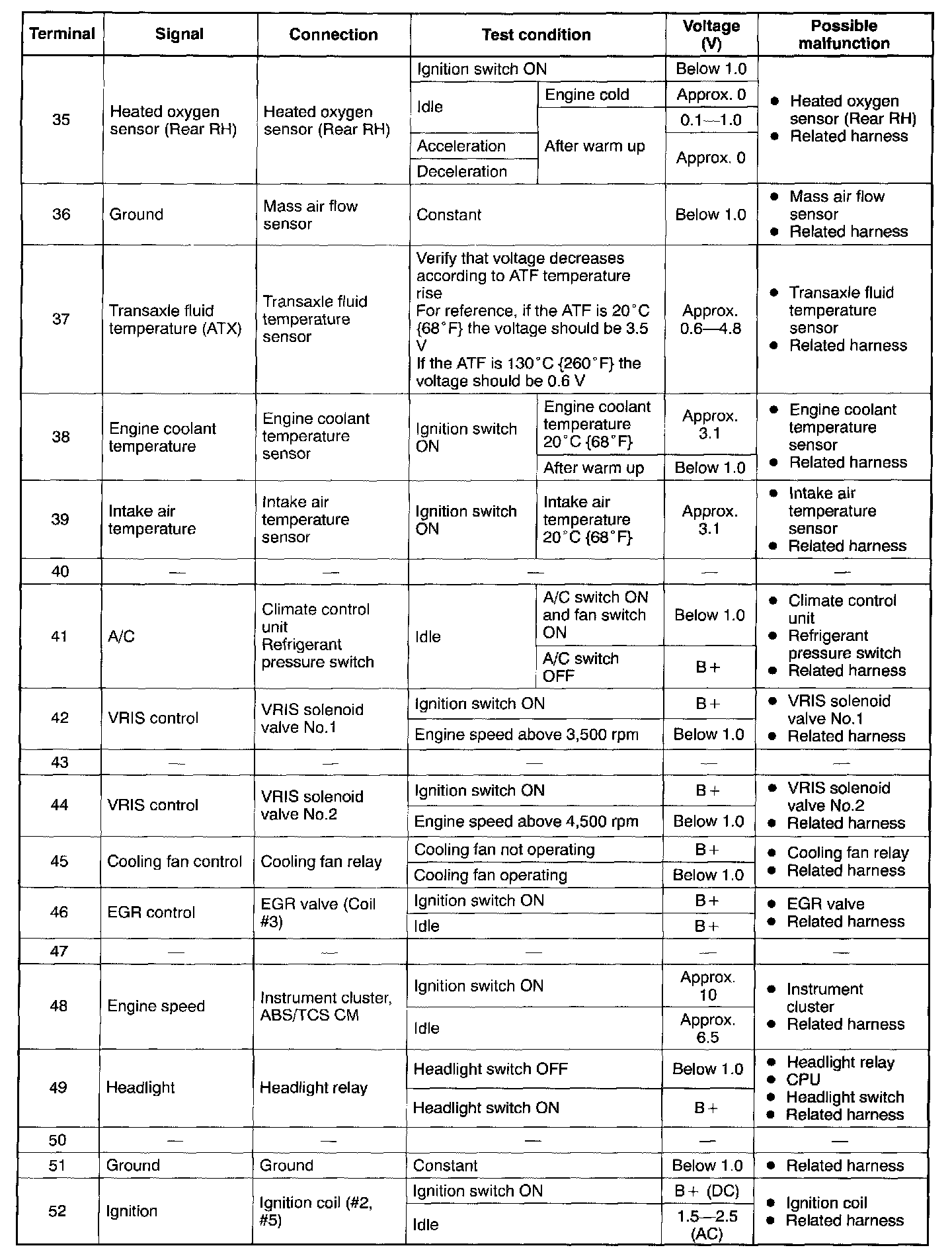 - If any incorrect voltage is detected, check related Systems, wiring harnesses and connectors referring to the possible malfunction in the terminal voltage list.