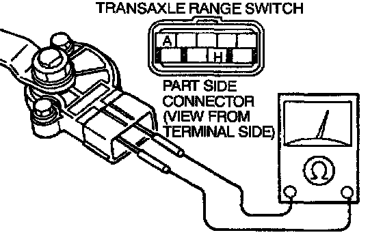 12. Verify that there is continuity between terminals A and H of the transaxle range connector.