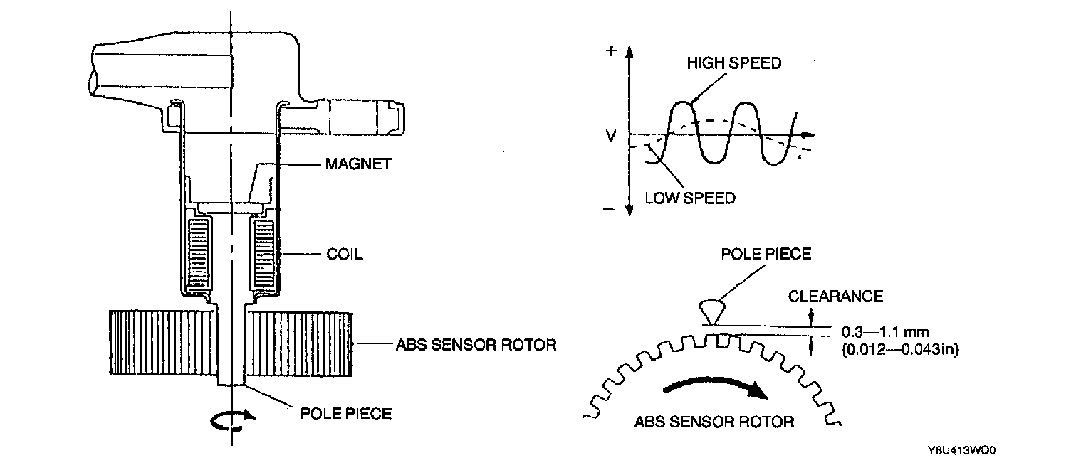 ^ The ABS wheel-speed sensors work in conjunction with the rotors to detect wheel revolutions. Each consists of a permanent magnet, coil, and pole piece, and is installed on the knuckle. These produce electrical pulses by monitoring the rotation of the sensor rotors installed on the drive shafts and the wheel hubs.