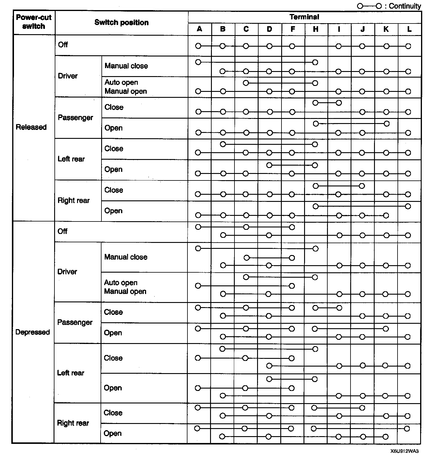 3. Inspect for the continuity between the power window main switch terminals by using an ohmmeter.
