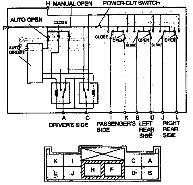 4. When checking the driver's side window switch, connect the B+ to terminal H and connect the ground to the terminal F.