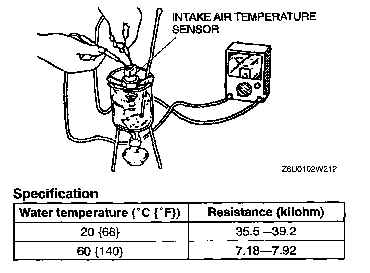 2. Place the intake air temperature sensor in water with a thermometer, and heat the water gradually.