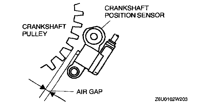 2. Measure the air gap between the crankshaft pulley teeth and the crankshaft position sensor using a feeler gauge.