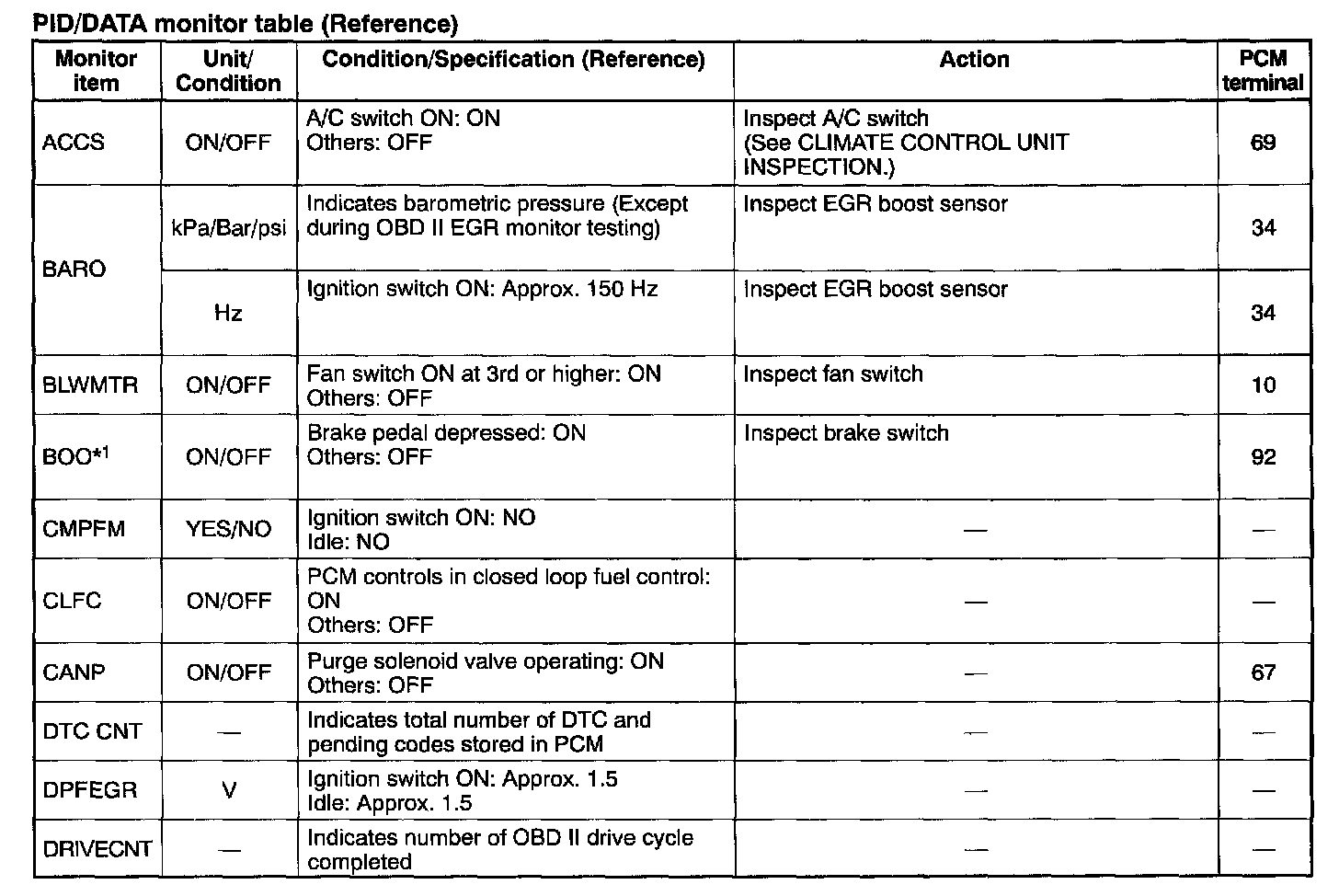 PID/DATA Monitor Table (Reference) Part 1: