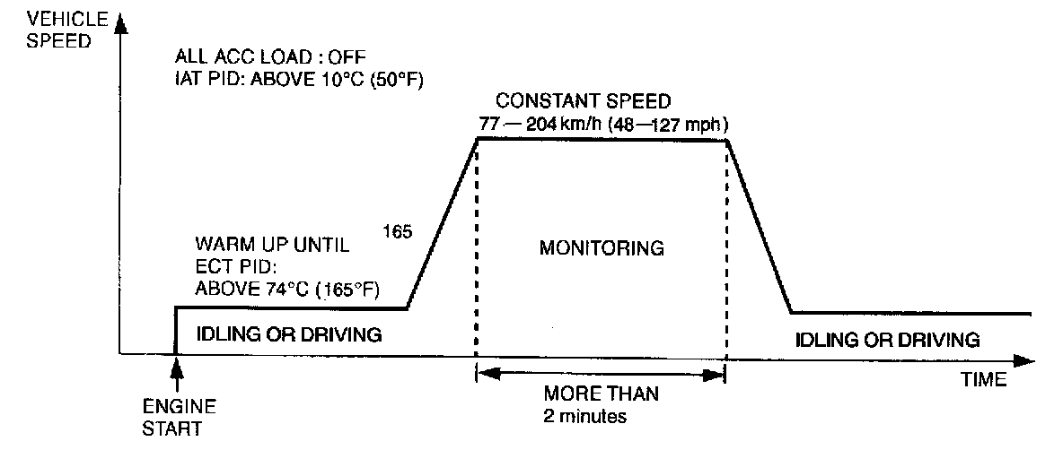4. Drive vehicle within 77 - 204 km/h {48 - 127 mph} and maintain a constant speed for at least 2 minutes.