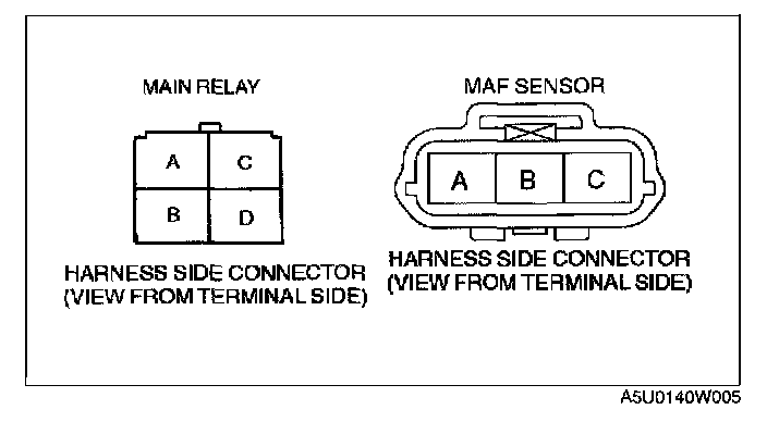 - MAF sensor connector terminal C and main relay terminal D through common connector to GND.
