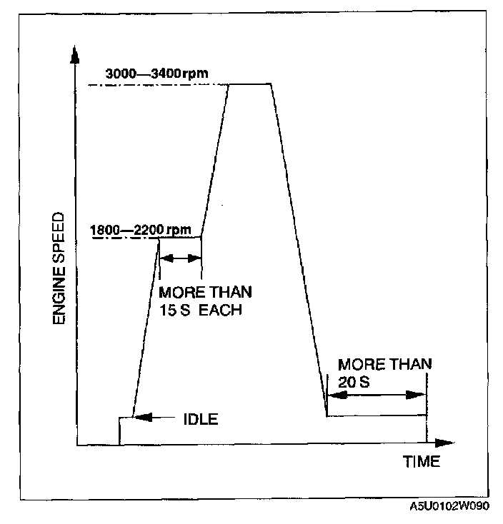 3. Perform no load racing at the engine speed shown in the graph, then idle the engine for more than 20 s after the cooling fan stopped. If possible, monitor RPM PID for engine speed and FAN2 PID (with A/C), FAN1 PID (without A/C) for cooling fan status during this procedure.